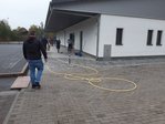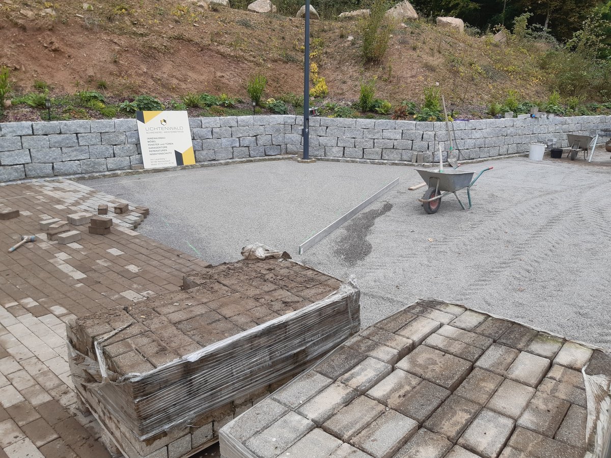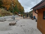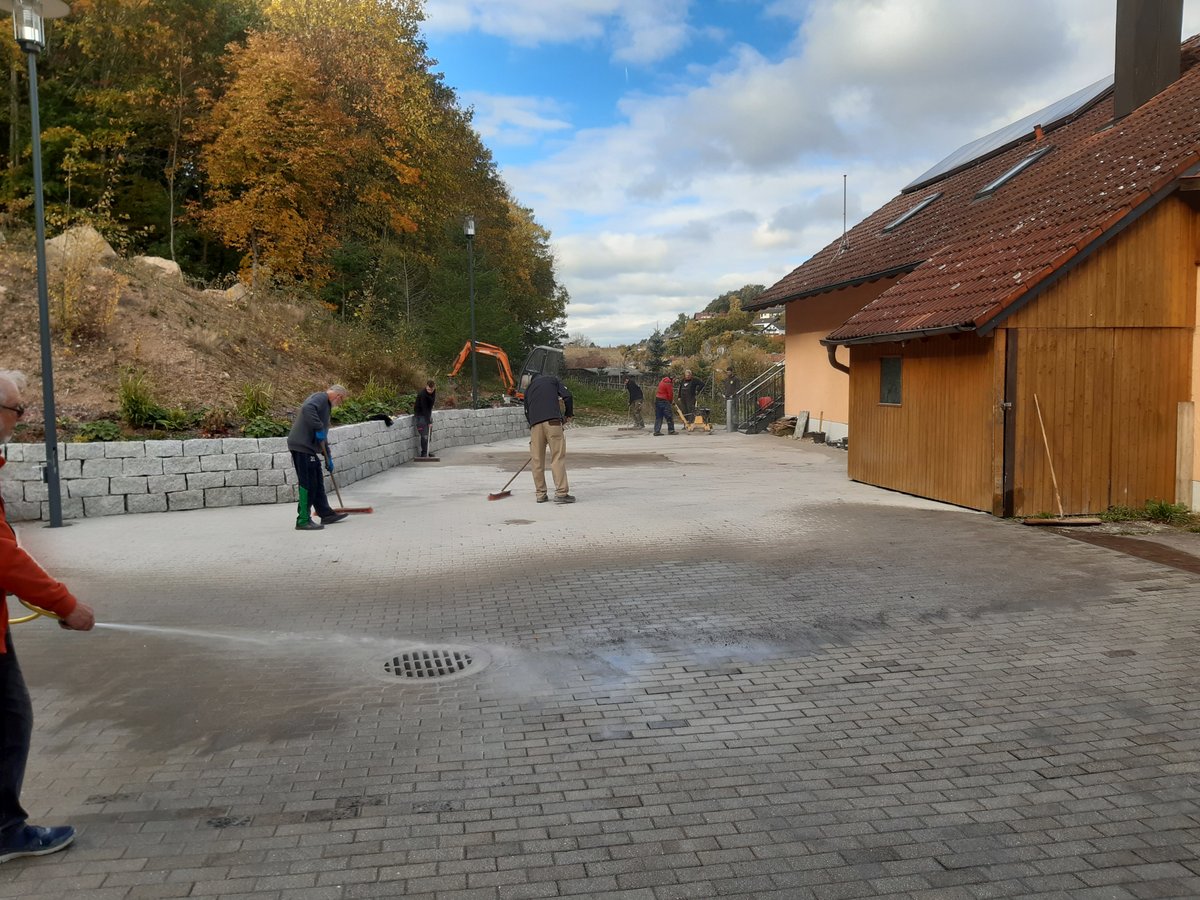 An den Wochenenden im September und Oktober 2025 wurden nochmals viele Arbeitskräfte mobilisiert um den großen Vorplatz und die Parkplätze zu Pflastern. Hier kamen zum Großteil die Pflastersteine unserer Räumungsaktion zum Einsatz.